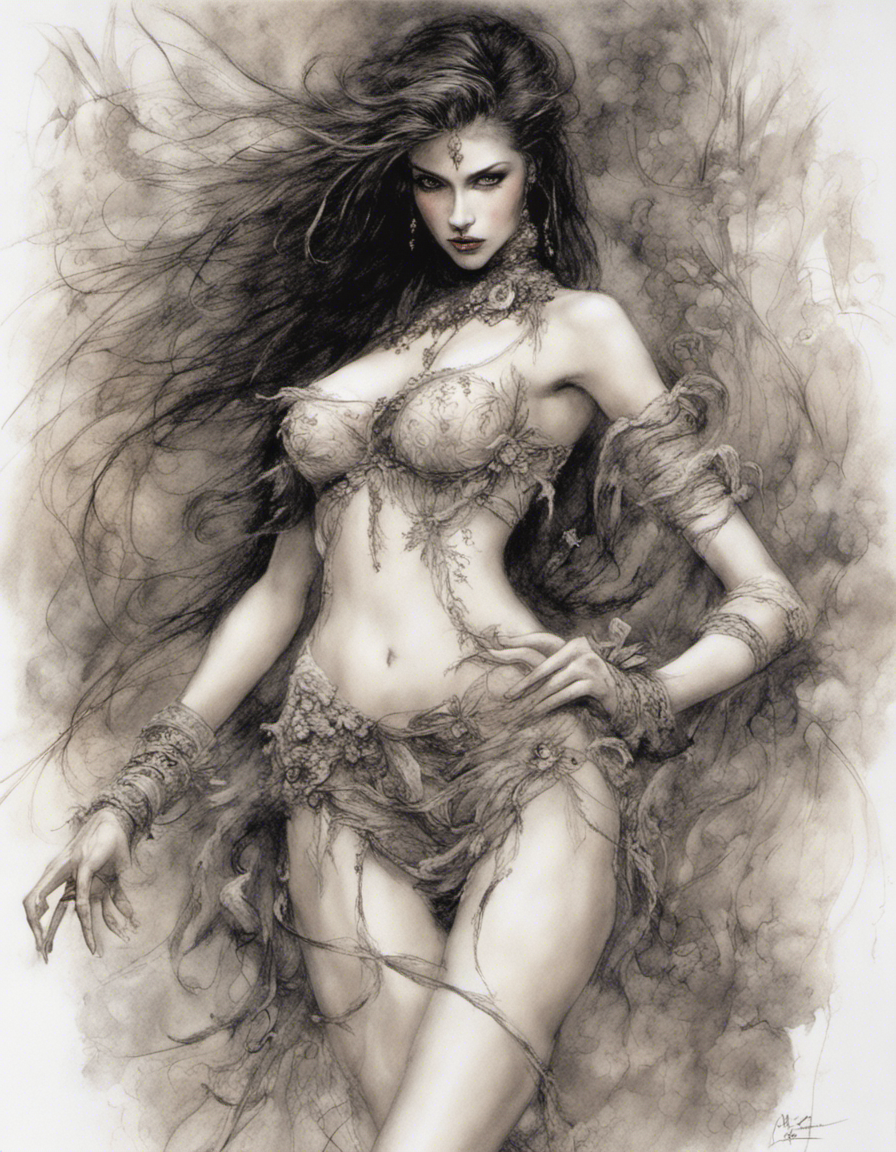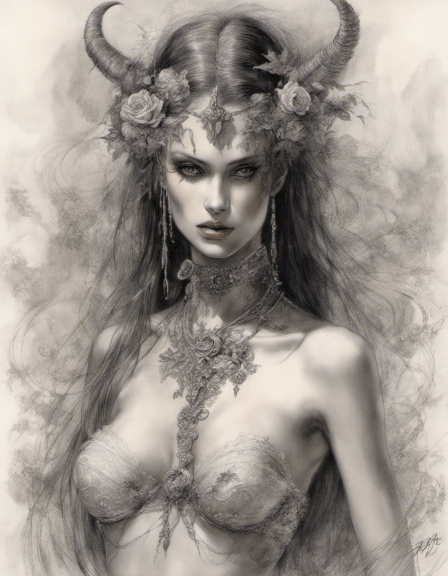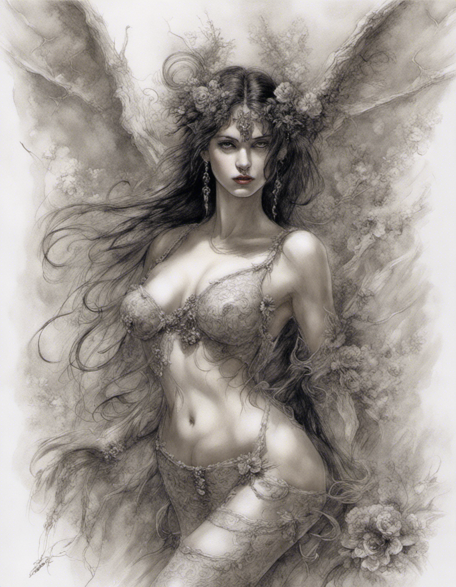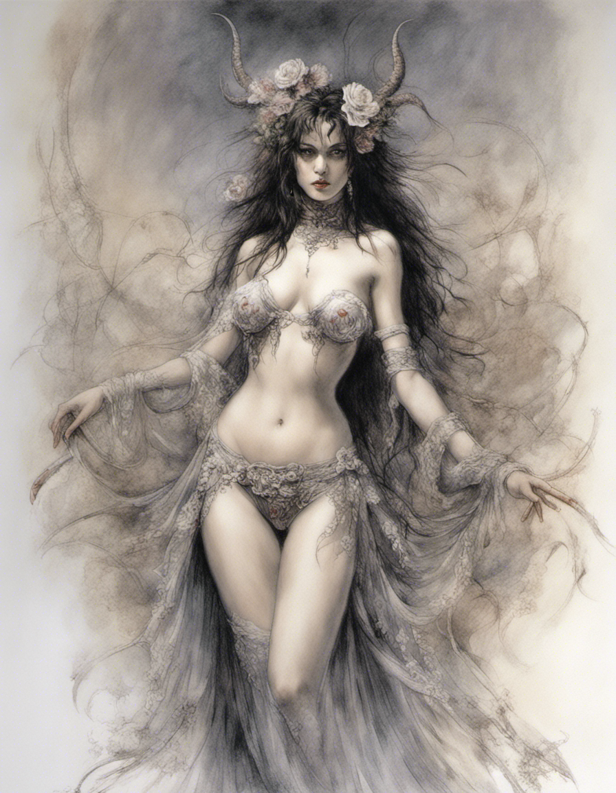 (((nuditi))) Dancing Ballroom Latin Creative Passion Full body portrait of Lilith Bra Floral Embroidered Lace on a devil seduction honeymoon relaxing by Luis Royo art by luis royo
