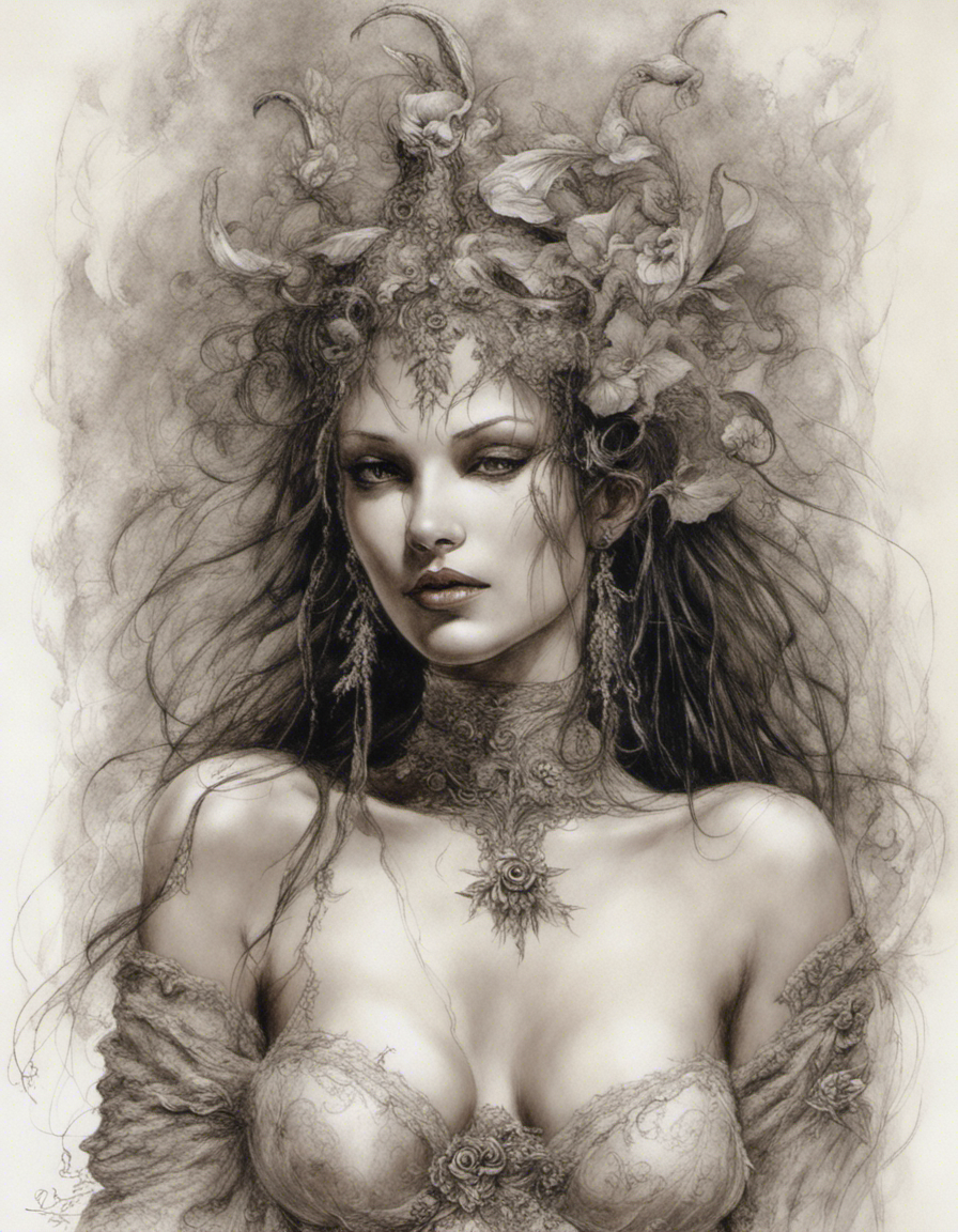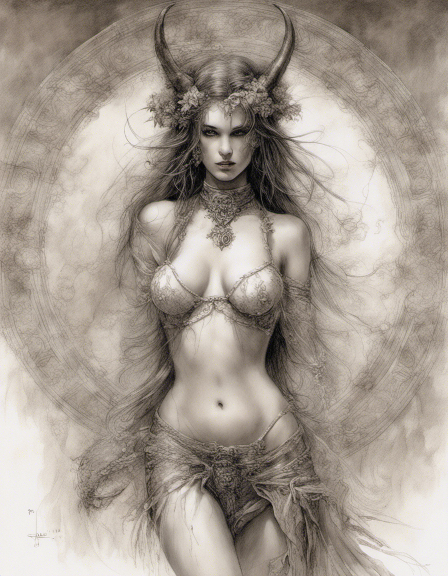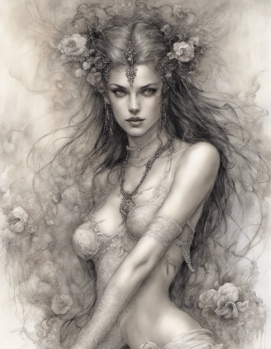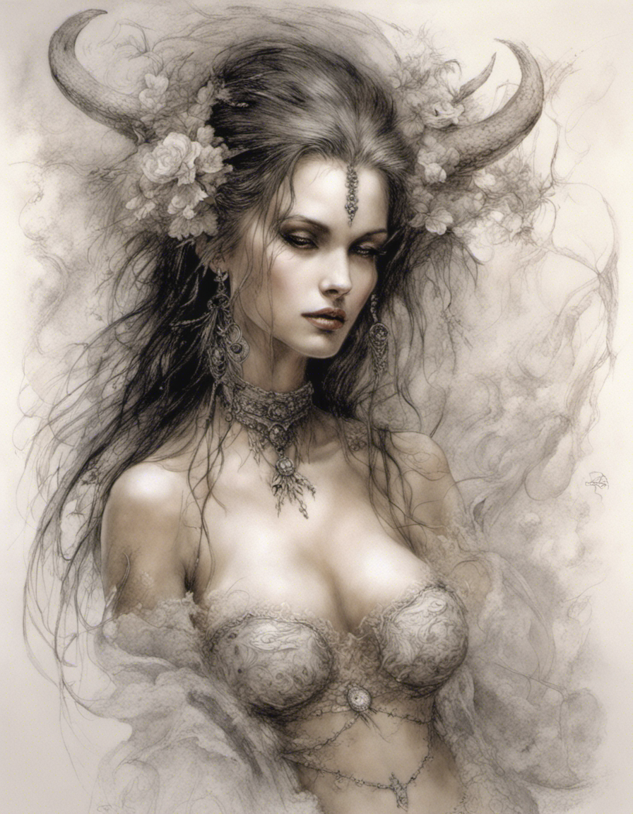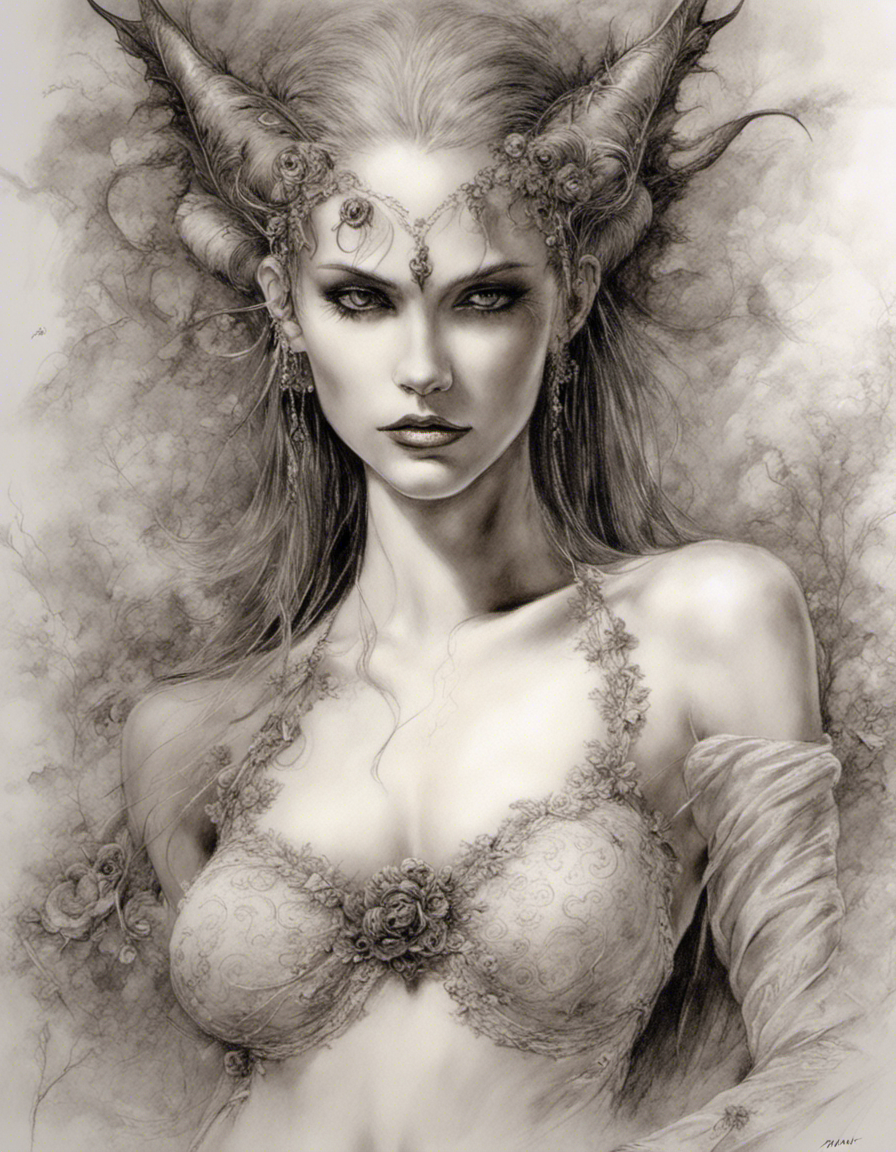 (((nuditi))) Dancing Ballroom Latin Creative Passion Full body portrait of Lilith Bra Floral Embroidered Lace on a devil seduction honeymoon relaxing by Luis Royo art by luis royo