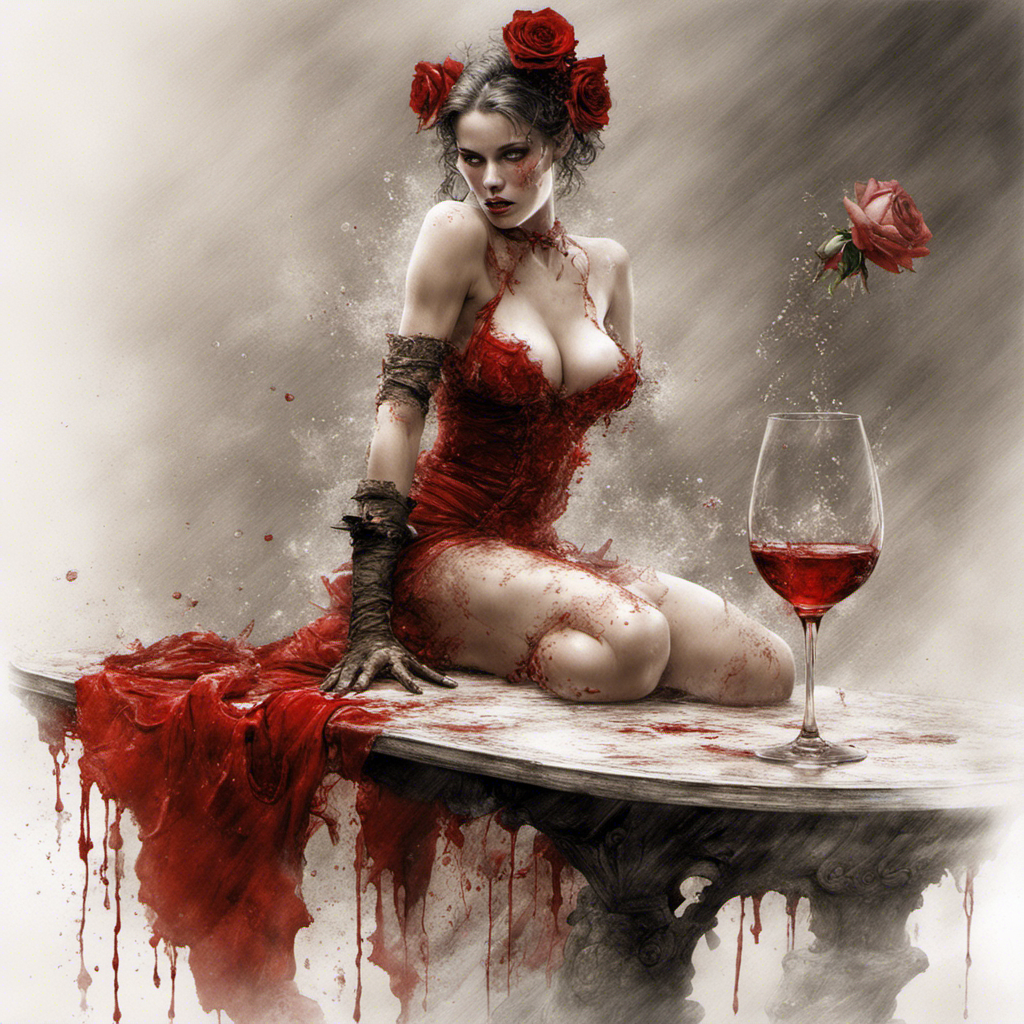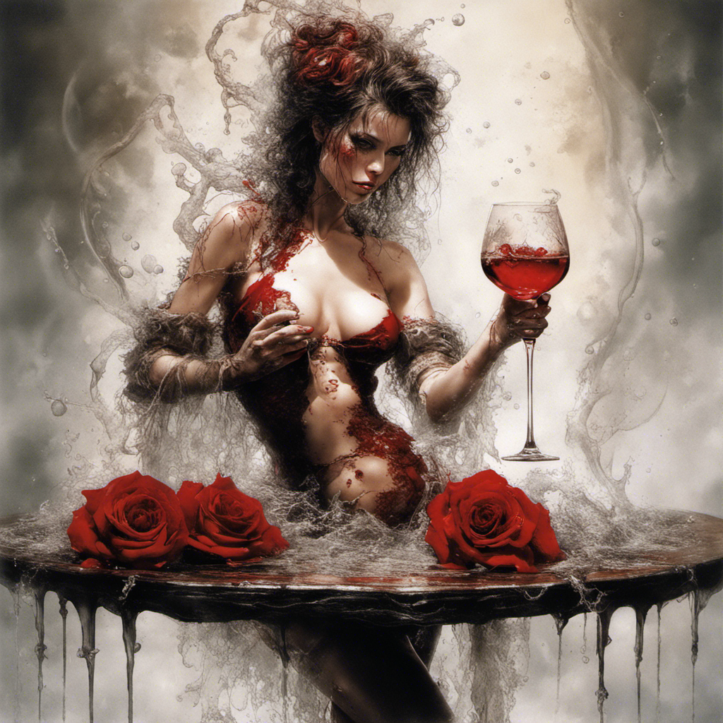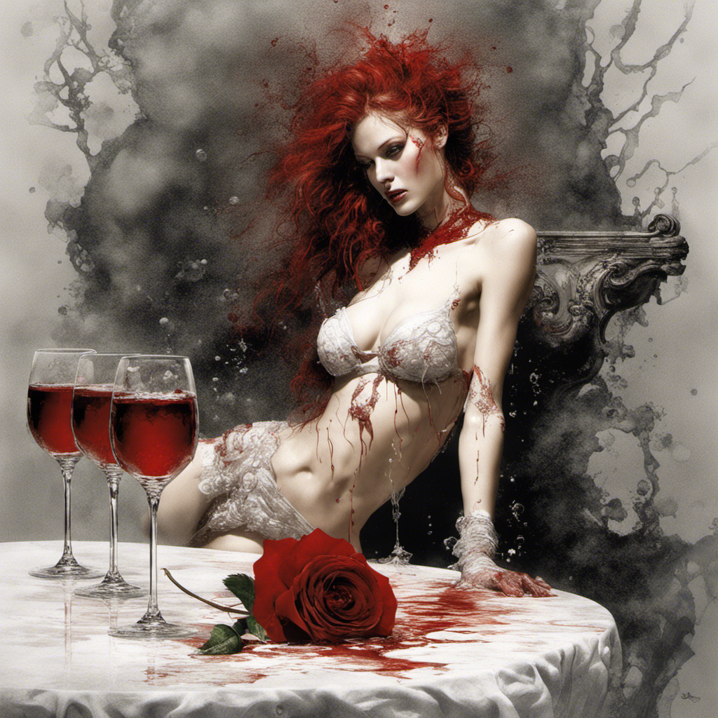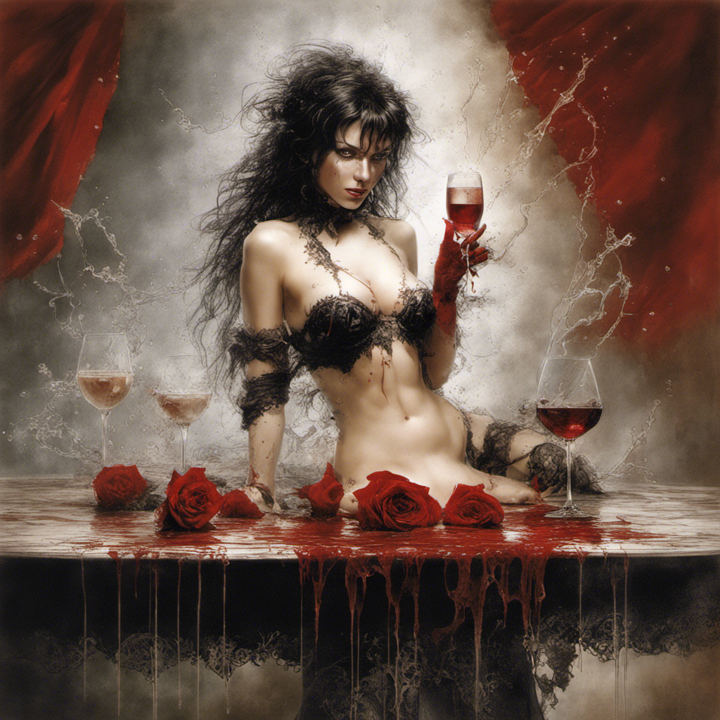 red rose on a table alberto seveso art Bra Full body portrait of Lilith relaxing maid in lace bikini with splashing sparkling glass wine splashing by Luis Royoy Luis Royo art by luis royo