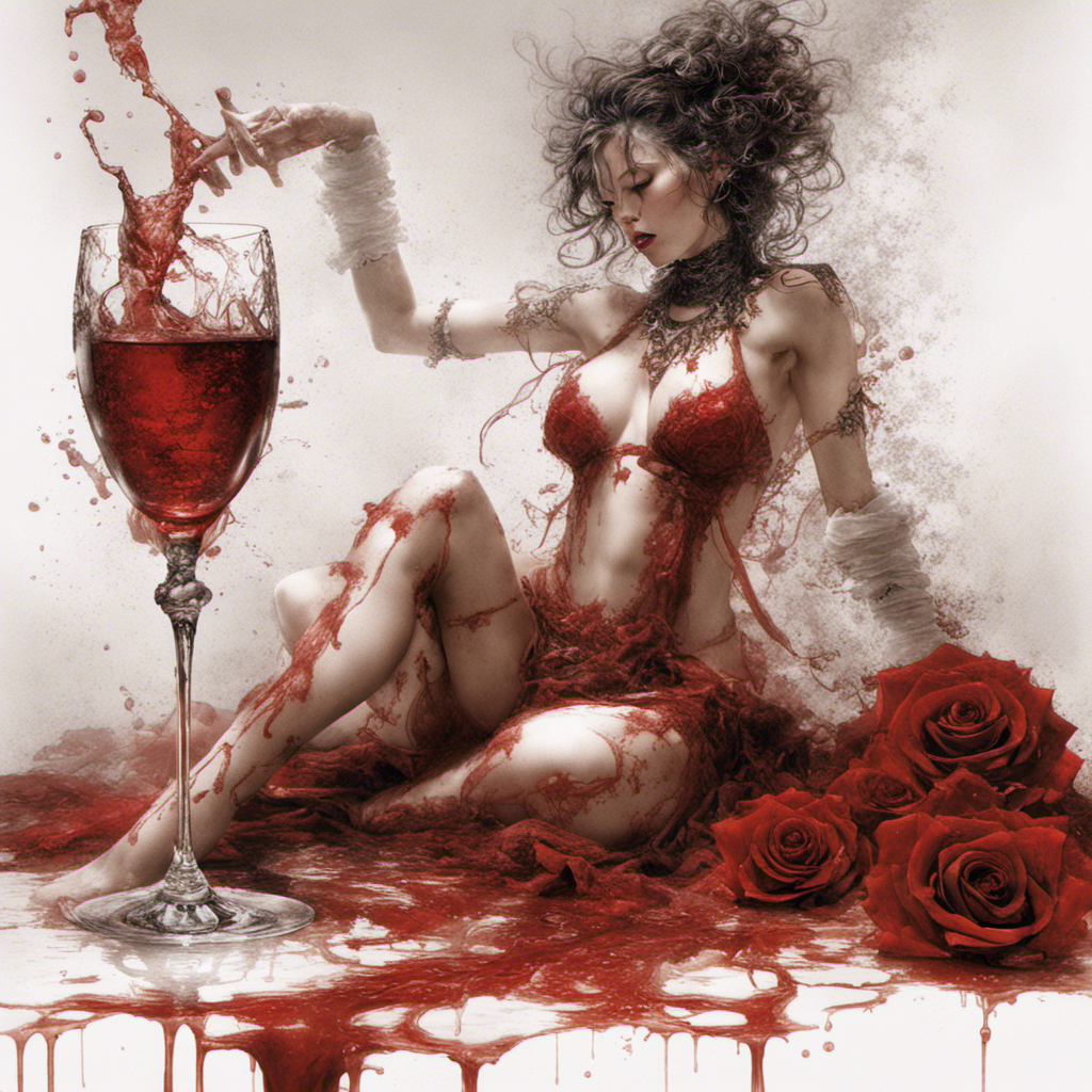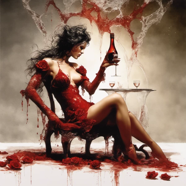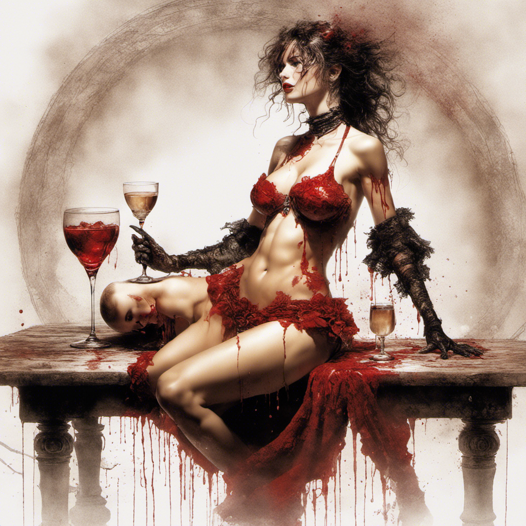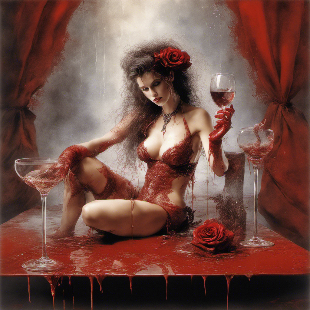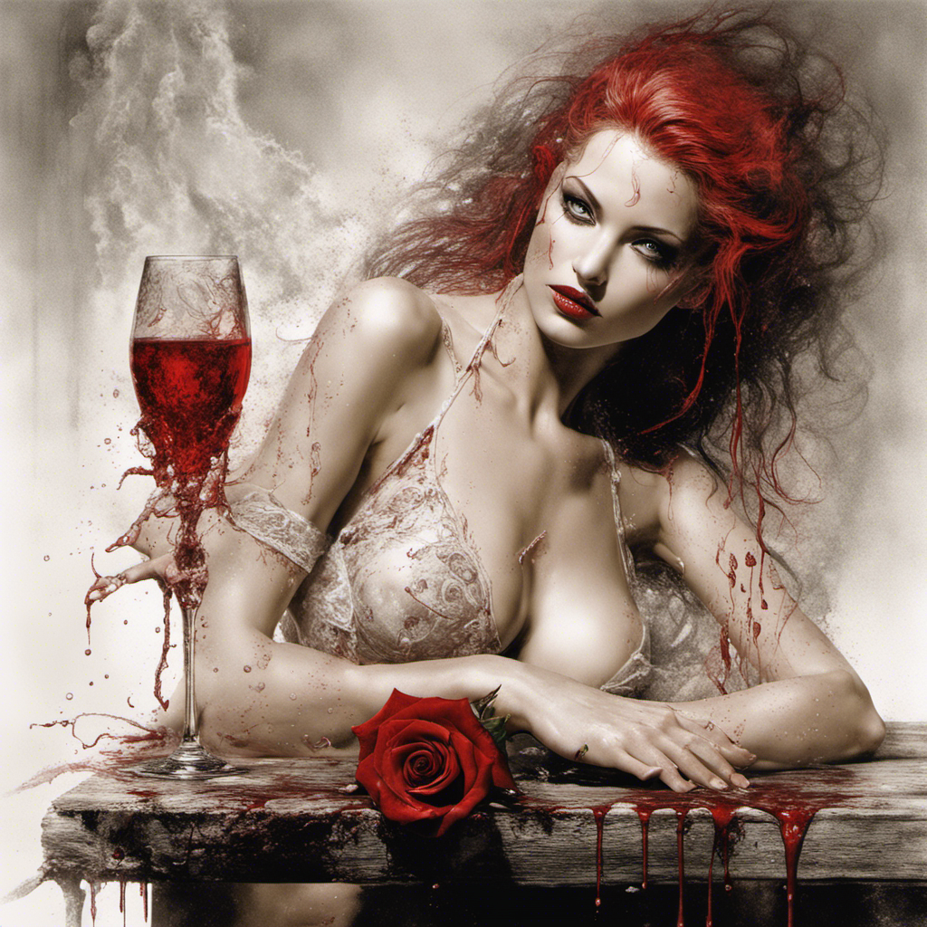 red rose on a table alberto seveso art Bra Full body portrait of Lilith relaxing maid in lace bikini with splashing sparkling glass wine splashing by Luis Royoy Luis Royo art by luis royo