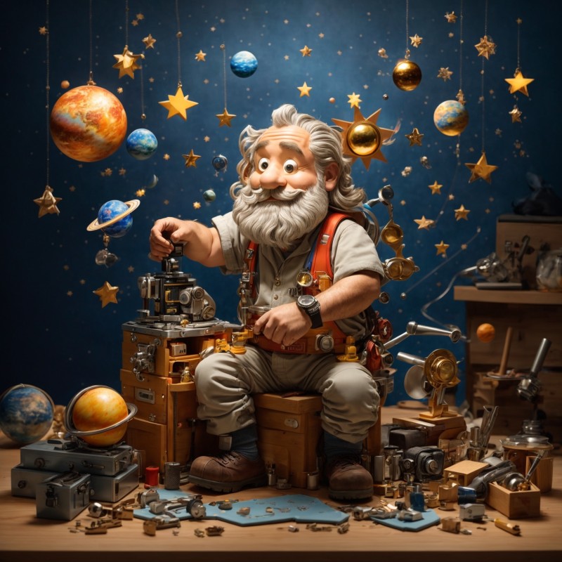 <p>cartoon caricature illustrating God with a toolbox, assembling the world piece by piece. Stars, planets, and the sun</p>